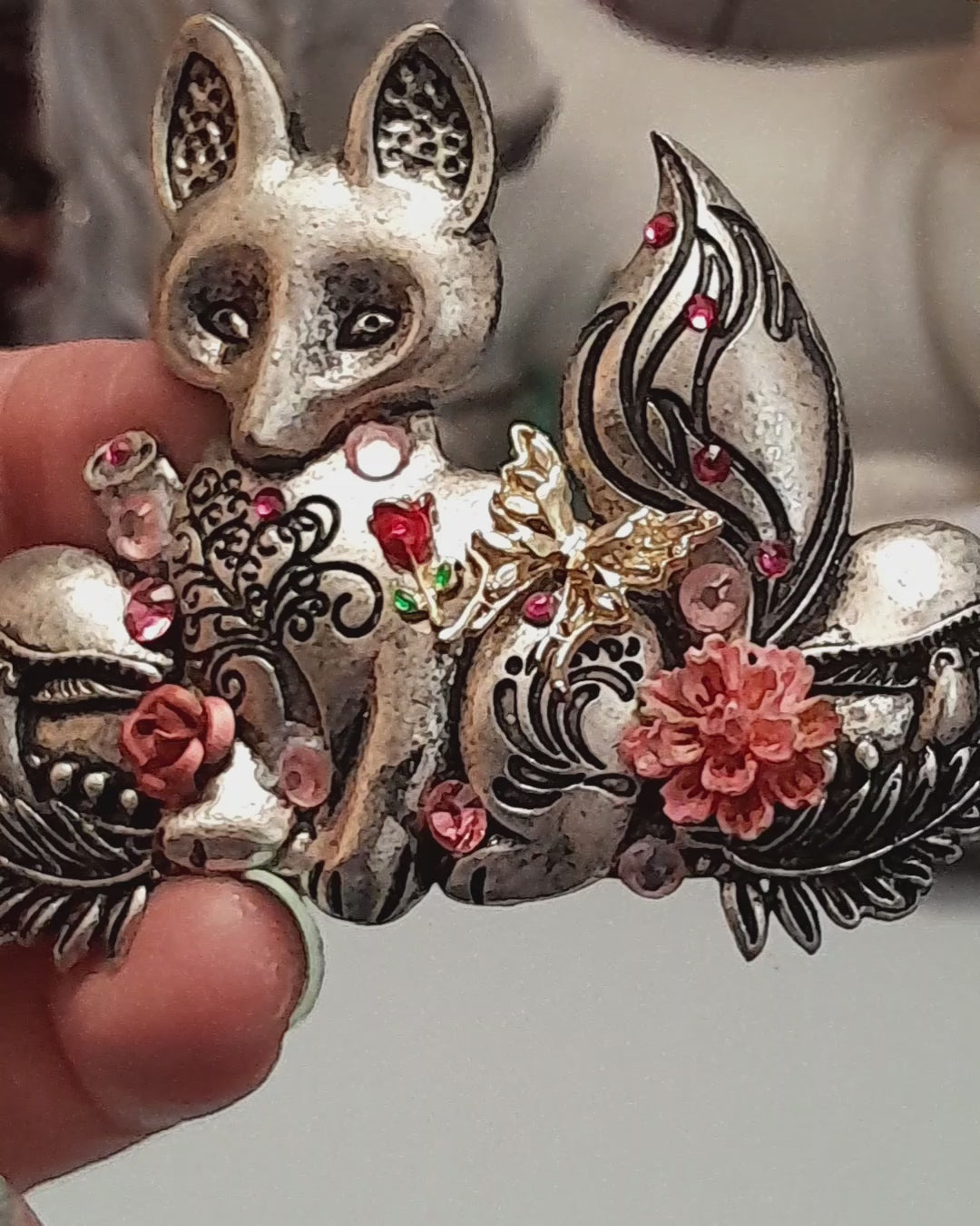 I designed this silver fox hairclip, surrounded by delicate flora, to bring a whimsical, magical touch to your hairstyle that feels both enchanting and magical.